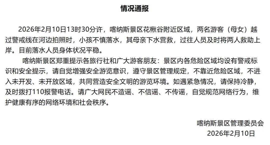 2026年2月10日13时30分许,喀纳斯景区花楸谷隔壁区域,两名搭客(母女)跳跃申饬线在河滨拍照时,小孩失慎落水,其母亲下水施舍,过往东谈主员实时将两东谈主救援上岸。现在落水东谈主员躯壳景况牢固。