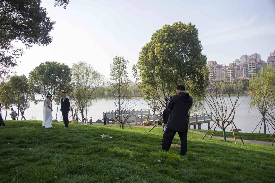 一双新东说念主在东瀛澜湖湿地公园莲花山区域拍婚纱照