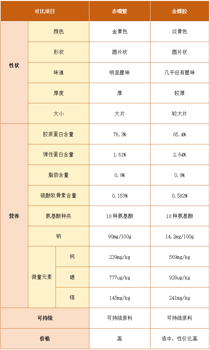 以赤嘴鳘鱼胶和金蝶胶对比为例。