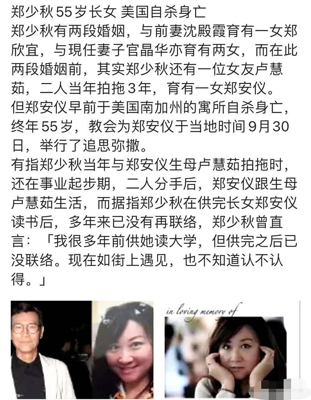 更让东说念主唏嘘的是大男儿郑安仪的结局。2023年,55岁的她因抑郁症在好意思国公寓自裁,遗体两天后才被发现。而郑少秋仅仅通过牙东说念主说了句“深感缺憾”,连葬礼都没去。网友们翻出旧采访,发现郑安仪从小就说“爸爸只爱责任”,成年后更是断交了关系。至于二男儿郑欣宜,天然随着沈殿霞长大,但缺父爱的童年让她和郑少秋经久隔着层纱,2025年退出《歌手2025》后就绝对淡出公众视野,连父亲入院的音信都没回复。